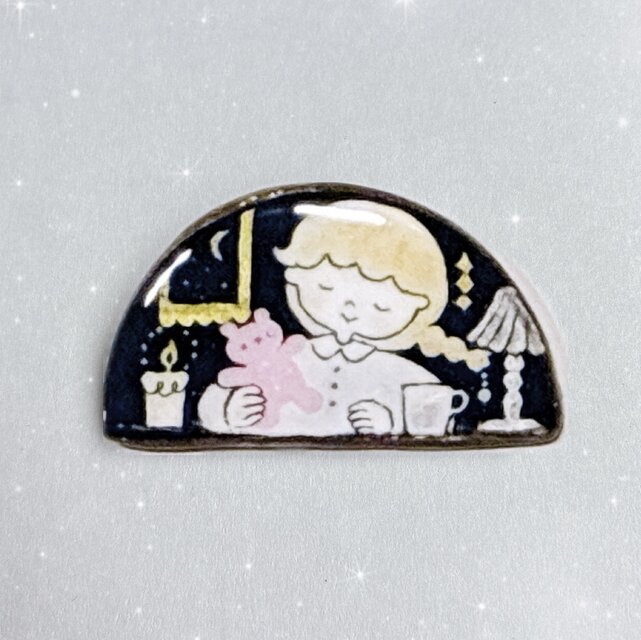 静かな夜のひとときを過ごす女の子のブローチ。