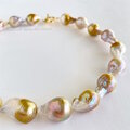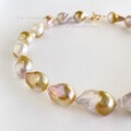 (右側のチョーカーは¥72000でゴールドが少なめで、キュートな形が面白いオイスターパールのチョーカーです)