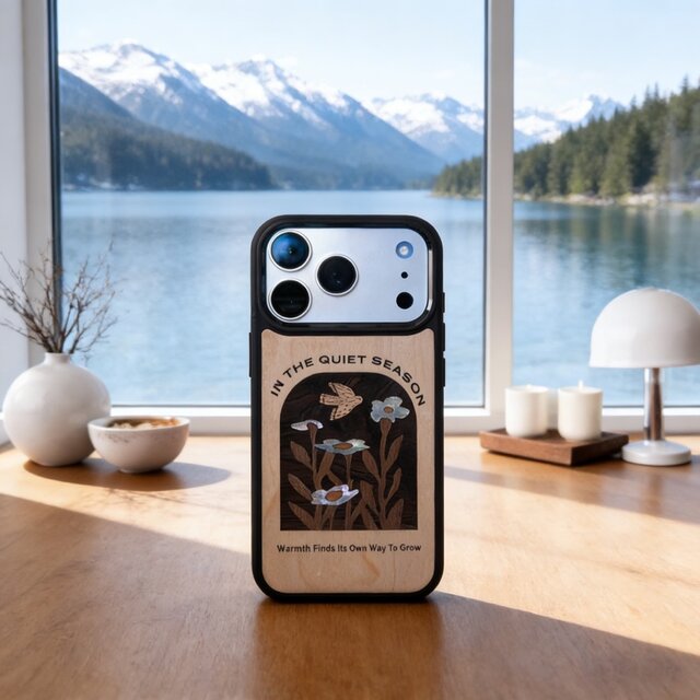天然木と天然貝を組み合わせ、自然のぬくもりと流れる色彩をひとつの景色のように閉じ込めた、アートスマホケースです。