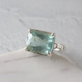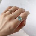 爽やかなブルーグリーンの中に、霧雨が降り注いでいるようなレイン状インクルージョンが特徴的なアクアマリンのリング