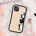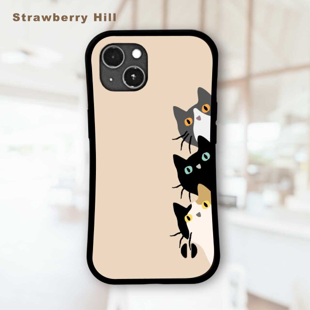 壁の向こうや角から、3匹の猫たちがこちらの様子を窺っているような瞬間を捉えたデザインです。
