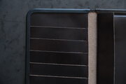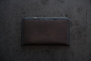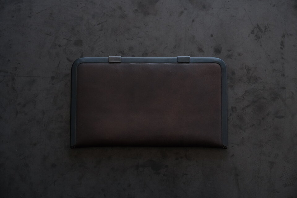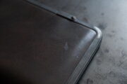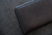 本体部分は立体成型ならではの革の角や凹凸の表情が、金具との組み合わせで際立ちます。カードケースと同じ構造ですが、こちらのロングウォレットは留め具が2箇所です。
