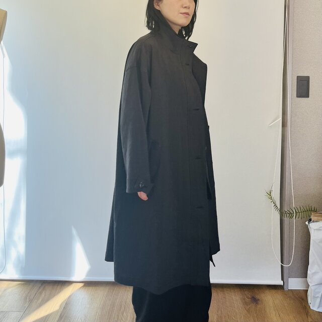 肌寒さの残る春から、梅雨寒の時期や秋口まで着ていただけるコートです。同型のコットンやリネンのコートに比べて1番薄手で軽いので、長い期間着用いただけそうです。