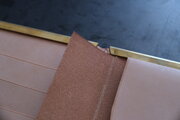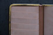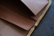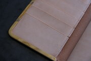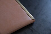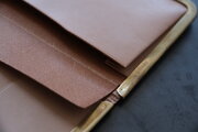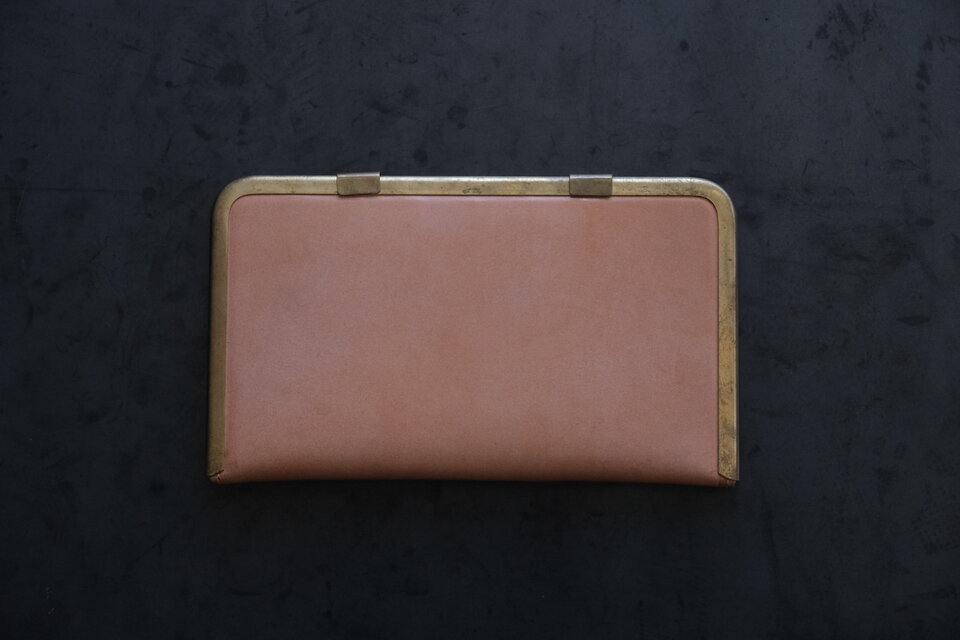 本体部分は立体成型ならではの革の角や凹凸の表情が、金具との組み合わせで際立ちます。カードケースと同じ構造ですが、こちらのロングウォレットは留め具が2箇所です。