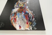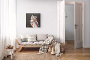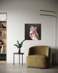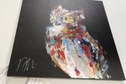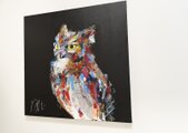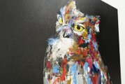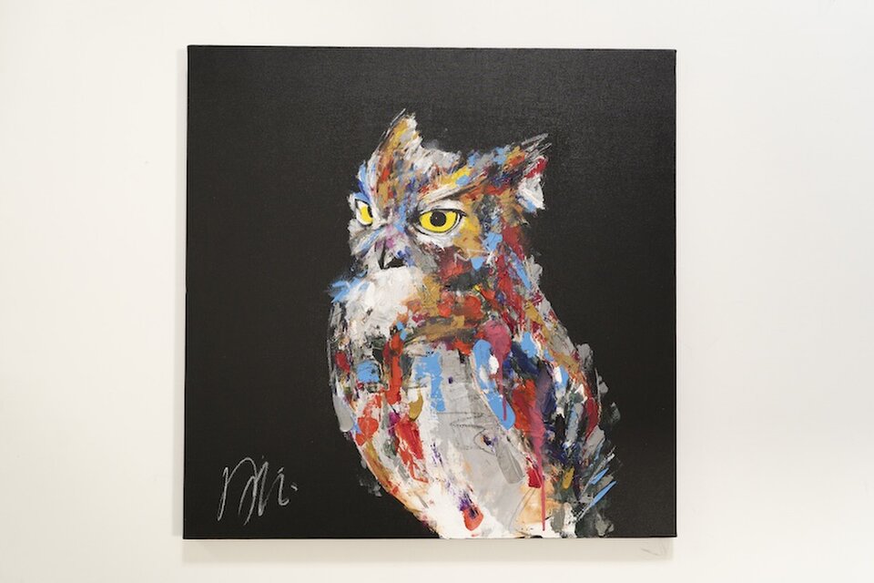 動物シリーズからフクロウのスプレーアート作品!知性や幸運の象徴でもあるフクロウを正方形キャンバスに表現した作品。沢山の色を使って表現されたフクロウがかっこよくもあり、可愛らしい作品になっています。フクロウ好きには大変おすすめで、贈り物の絵としてもおすすめです。