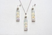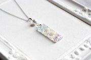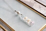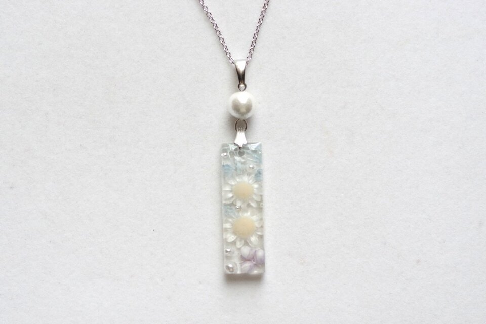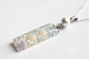 長方形のレジンに白いお花二輪と紫色のつぼみ、青い葉を入れ、パールやブリオンを添えたシンプルながらも華やかなペンダント。