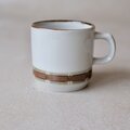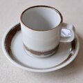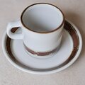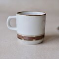 カップ下部とソーサーの縁に沿って、赤茶色(テラコッタ)とグレージュによる、