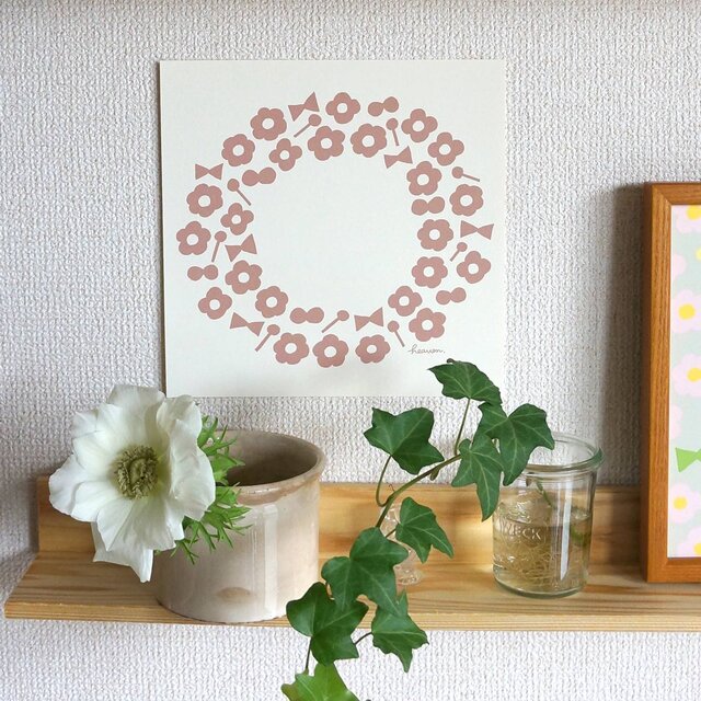 「 flower pop wreath(milk brown) 」 20cm角ポスター