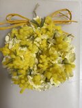 春らしいみもざのリースです。土台のリースは15センチ、リースの高さは7から8センチです。リースの幅は約20センチ。玄関に飾っても、机にリースをおいても。また、母の日のおくりものとしても。