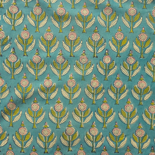 インド ブロックプリント生地 [50cm単位切売] サンガネリ ピンクフラワー on ティールブルーIF0523