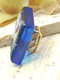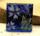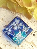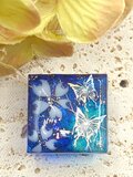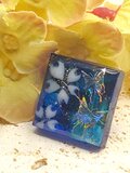 青系のレジンの中に白い花と蝶が閉じ込められた作品です。光の加減で青色が変化して見えます。