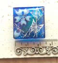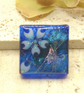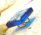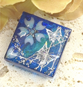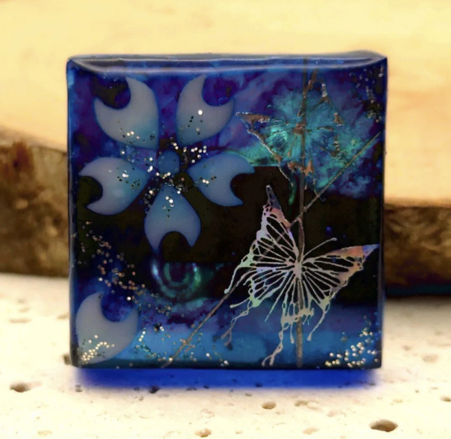 青系のレジンの中に白い花と蝶が閉じ込められた作品です。光の加減で青色が変化して見えます。