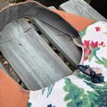 反対側はシワ加工された綿麻に丸いモチーフを飾りました。