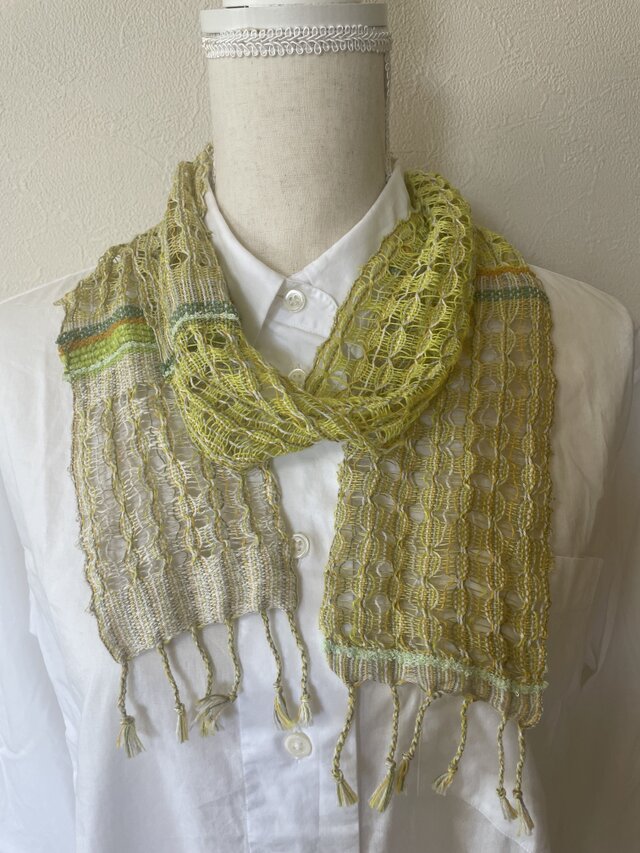 コットンとリネンの透かし織りミニマフラーです。軽くて涼しげな肌触りです。