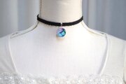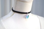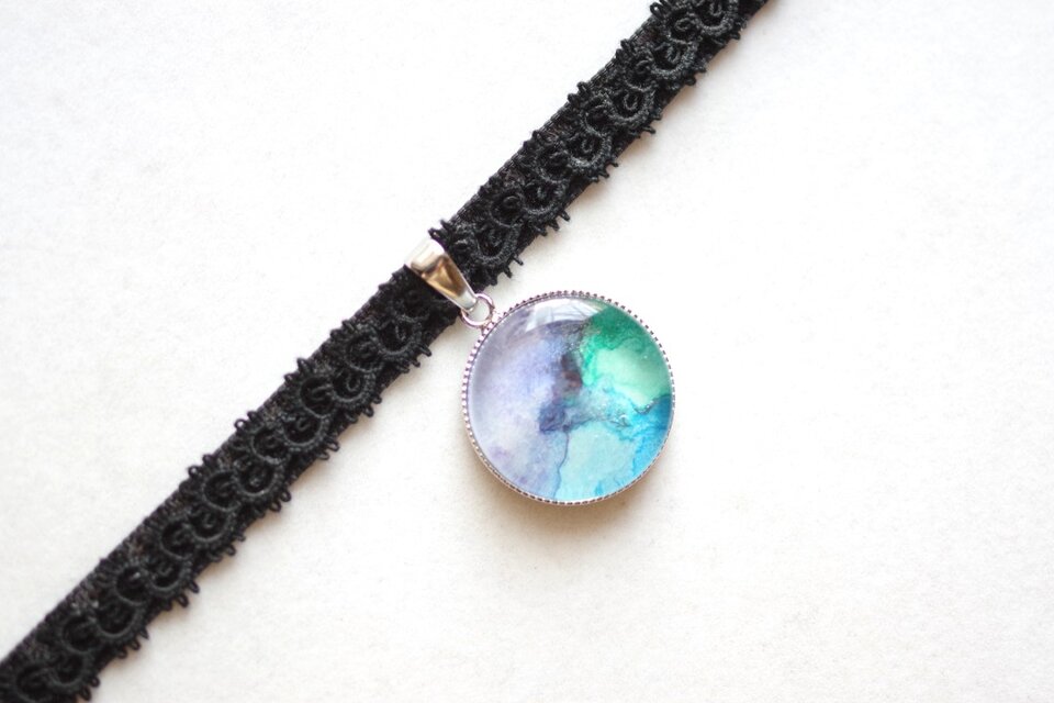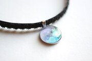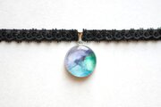 水彩絵の具で描いたような滲んだ紫と緑、青が美しい模様を描いてるレジンを、ベルベットリボンにタティングレースで装飾を施したチョーカーに仕上げました。