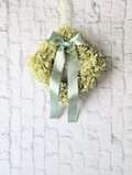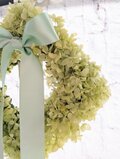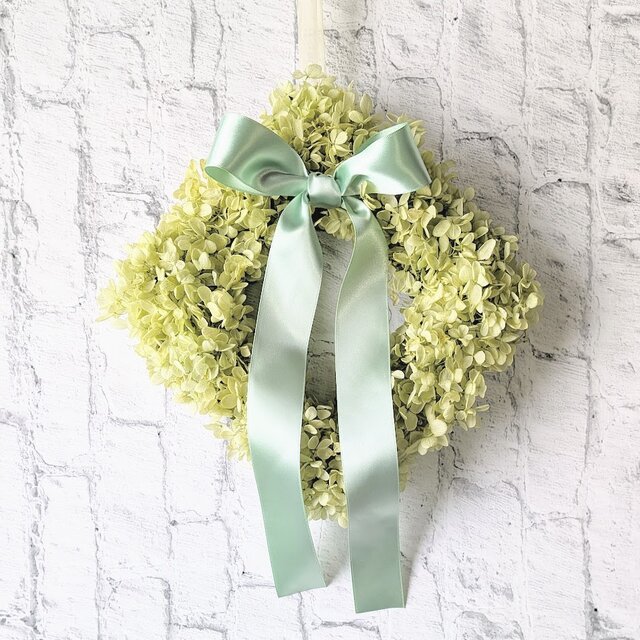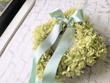 淡いグリーンのプリザーブドアジサイに、光沢のあるピスタチオグリーンのリボンが上品な印象です。
