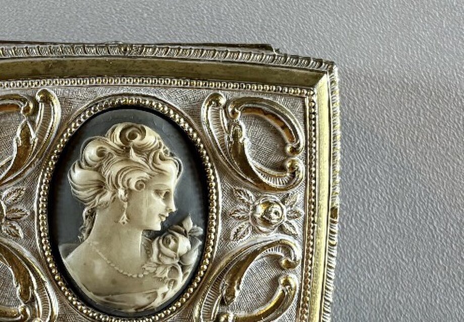 中央には優美なカメオ風装飾をあしらった、気品漂うアクセサリーケースです。