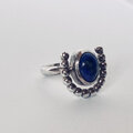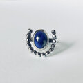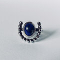 深く澄んだラピスラズリの青を、銀の小粒が弧を描くように包んだリングです。