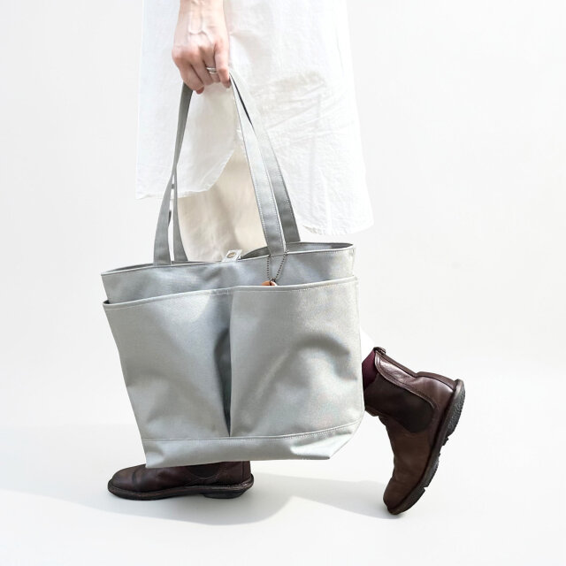 市場でお買い物をイメージして作ったバッグ。大き目のマチとたくさんのポケット(10個)が荷物をしっかりと受け止めてくれます。