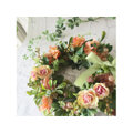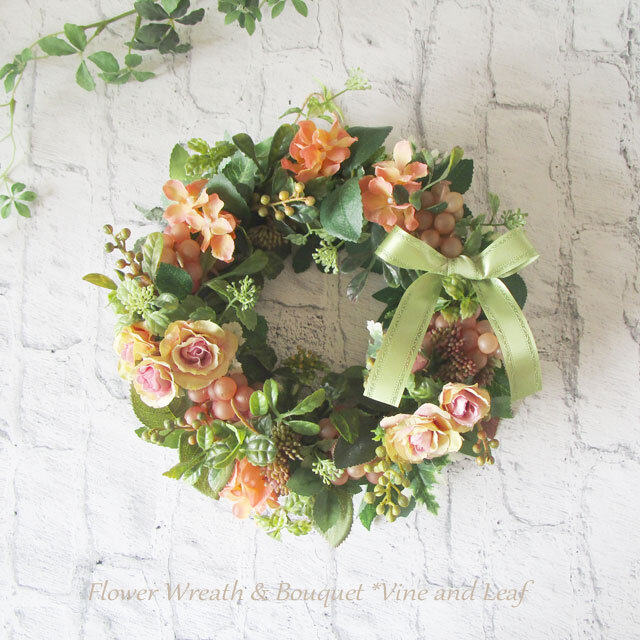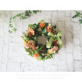 落ち着いたトーンのオレンジ色のバラを中心に、アジサイ、ベリーやブドウなどの実もの、多種のグリーンをあしらった、上品なアーティフィシャルフラワーリースです。