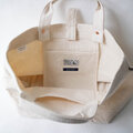 内側にポケット二つ。広いマチの丈夫な造りで丸洗いできる使いやすいバッグ。