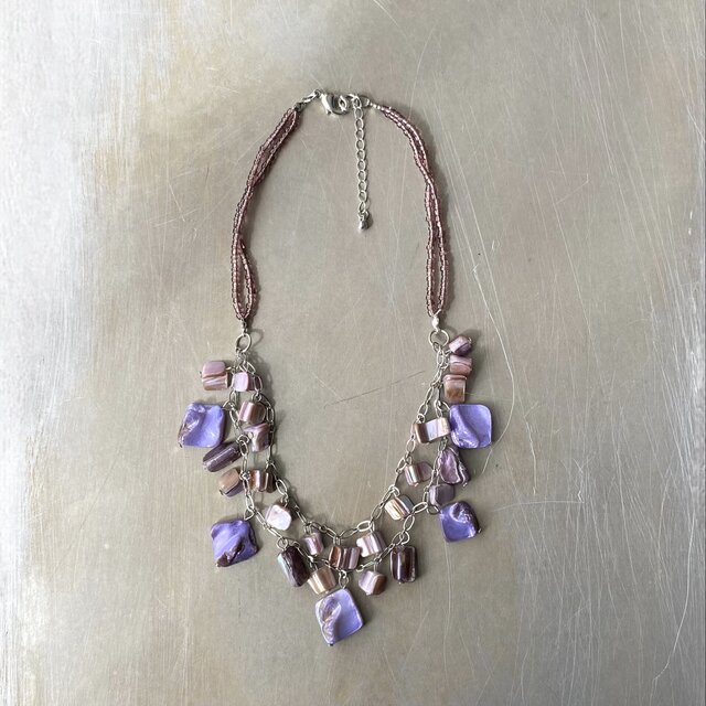 パープルカラーのシェルが揺らめく個性的な雰囲気のUSAヴィンテージネックレス。ボリューム感がありお顔まわりを華やかに彩ってくれます。