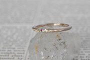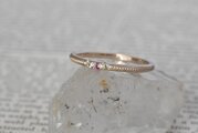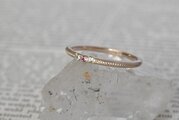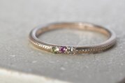 リングの半周にミルを打ちペリドット・ロードライトガーネット・クォーツと3つの石を並べて留める、願いが込められた石たちの輝きとリングそのものが持つ輝きの両方を日常の中で楽しめる作品です。