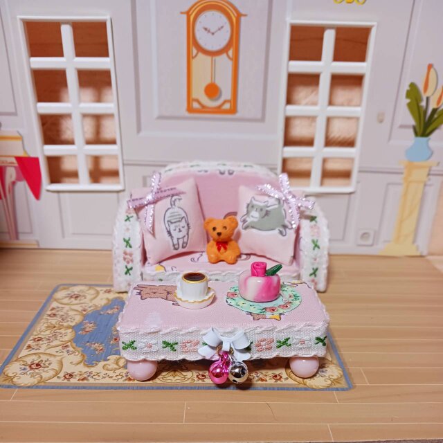 ミニチュア 柴犬ピンクのソファー6点セット 手作りケーキ・アイスコーヒー付き柴犬ソファー届きました。 とてもかわいいです! 大切に飾らせて頂きます。 ありがとうございました。