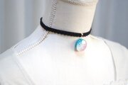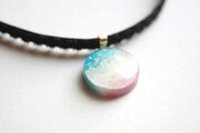 まだほのかに明るい夕方の空と、星の光る夜が同時に存在する黄昏時の美しい空をイメージしたレジンを、ベルベットリボンにタティングレースで装飾を施したチョーカーに仕上げました。