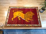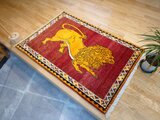 真っ赤な茜色の背景に、堂々と鎮座する黄金色のライオン。一度目が合えば忘れられない、圧倒的な存在感を放つオールドギャッベです。
