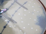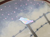 スズメや雪の部分にはラスター釉薬が施されており、光の角度によって虹色にきらりと輝きます。