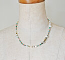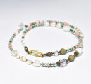 ヴィンテージオーロラビーズ、つぶつぶブラス、多彩マザーオブパール、淡水パール、フランスヴィンテージ、ピンクマサイを繋いだネックレスです。