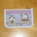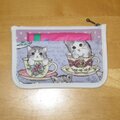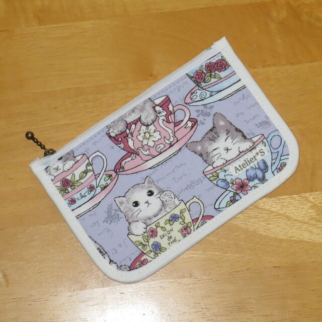 ティーカップに入ったかわいい子猫が描かれた生地にパープルのドットを合わせました。