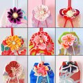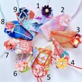 - 日本の伝統工芸技法「つまみ細工」で作った花をあわせました。花びら一枚一枚を丁寧に手作りしています