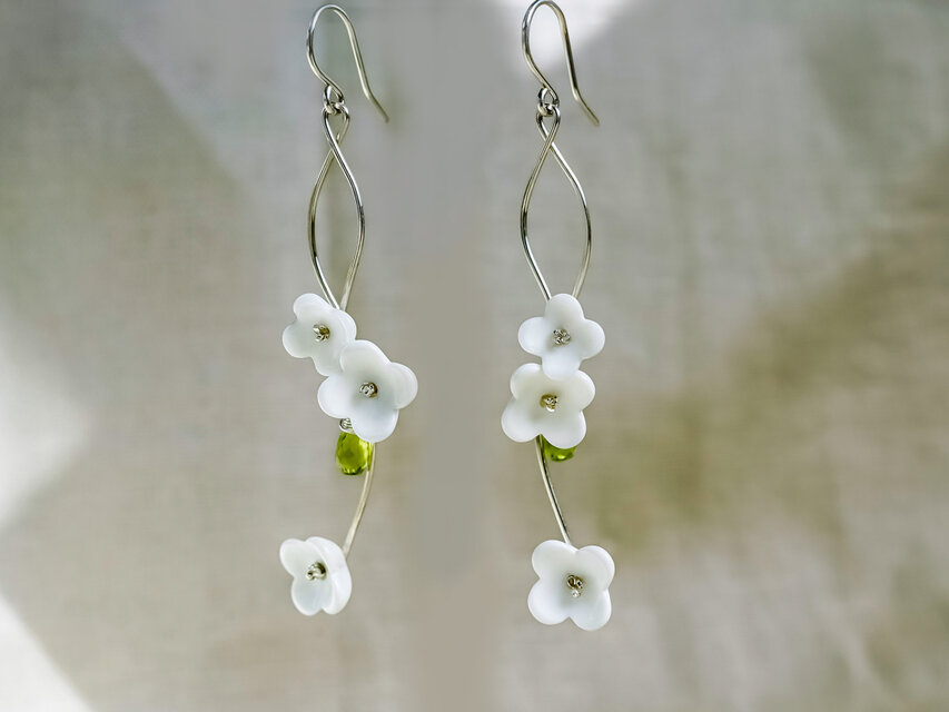 白い花が風にゆれるように、スターリングシルバーのワイヤーに沿って咲く3輪のフラワーモチーフ。日本製のガラスビーズを使った花びらは、つややかでありながら柔らかな質感があります。アクセントのペリドットのグリーンが、白の清潔感をほんのり温かく引き立てています。