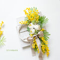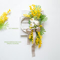 ミモザとラナンキュラスなど、春のお花たちを束ねてリースにしました。