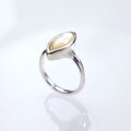 滑らかな曲線を描く夜光貝を、モダンな印象のシルバー枠で包み込んだリングです。