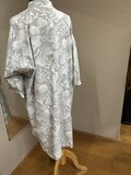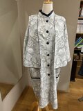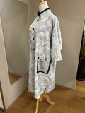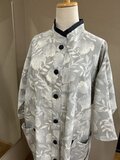 とてもしっかりした大島紬大きな花柄でとても華やかな上品な柄です。ポケット~~ボタンに男物紬紺色を使用アクセントに脇スリット