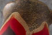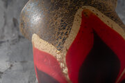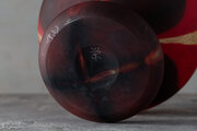 本作品は、日本の現代ガラス工芸の聖地、東京・新宿の弁天町工房で生まれた至高の一品です。最大の特徴は、表面に施された繊細なフロスト(艶消し)加工にあります。岩田久利が追求した「内側から滲み出る光」を表現するため、あえて表面の反射を抑え、積層された赤と紺、そして金彩を霧の中から浮かび上がる炎のように演出しています。
