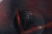 The core is a dramatic collision of fiery red and deep midnight indigo, interspersed with gold-like metallic dust. Through the acid-etched surface, these colors radiate rather than reflect, reminiscent of a morning sun rising through a dense forest mist. The undulating rim and organic silhouette evoke the spirit of a Phoenix. The "栄" (Sakae/Prosperity) mark on the base suggests this was an exclusive commission, representing the height of Japan’s aesthetic craftsmanship.