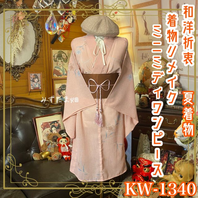 【 夏着物リメイク ミニミディワンピース/ドレス/ 帯サッシュベルト 薄紅藤のヴェール KW-1340 】