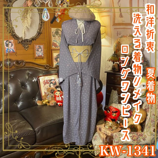 【 夏着物リメイク ロング ワンピース/ドレス/洗える化繊 帯サッシュベルト 滅紫のシースルー・モード KW-1341】