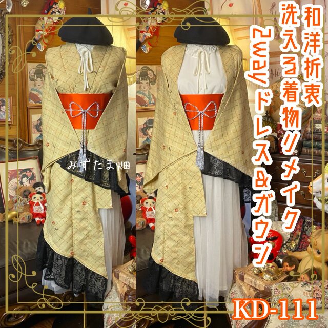 単衣着物 2way ガウン 羽織り ドレス ワンピース ハンドメイド 和洋折衷 洗える 化繊 リメイク 帯 KD-111