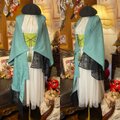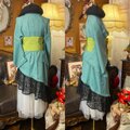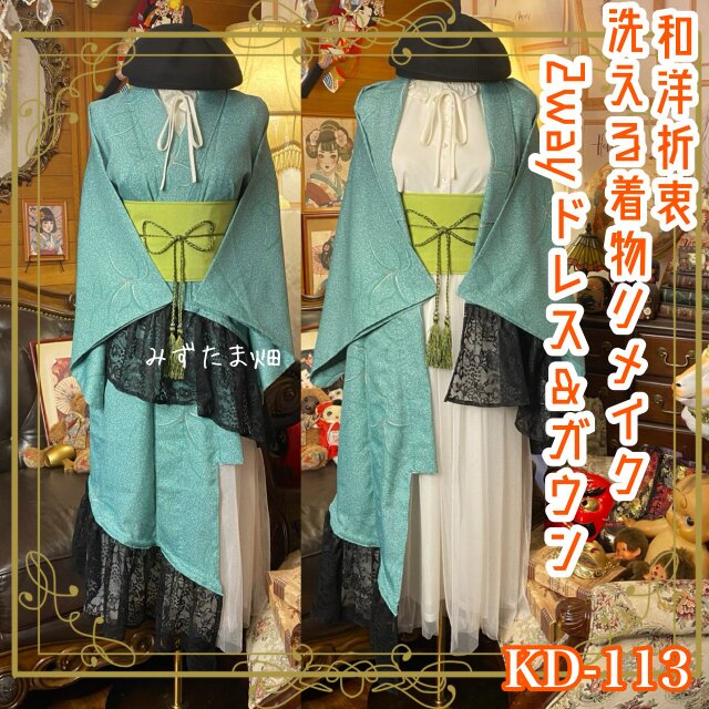 【単衣着物 2way ガウン 羽織り ドレス ワンピース ハンドメイド 和洋折衷 洗える 化繊 リメイク 帯サッシュベルト レトロ 古着 若草色の深淵と蝶のワルツ KD-113】