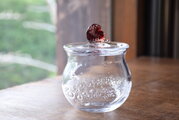 コロンとした丸みが愛らしい、蓋付きのガラスポットです。