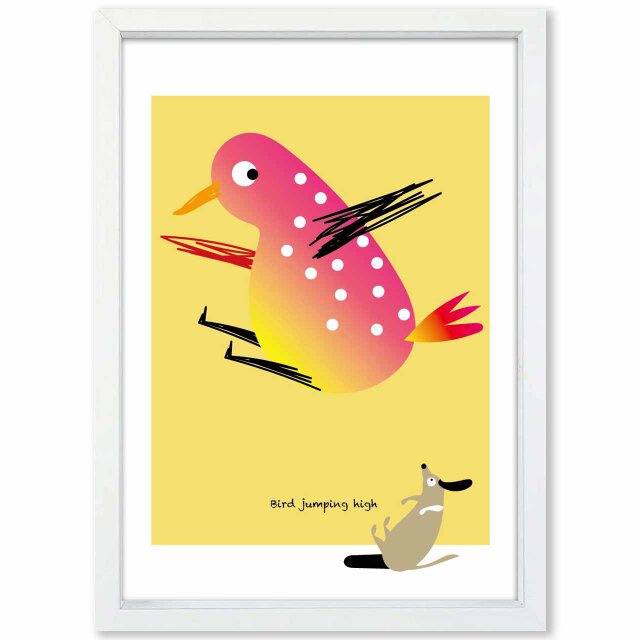 ワンちゃんビックリ 軽々ハイジャンプ 元気な陽気な鳥ポスター。