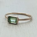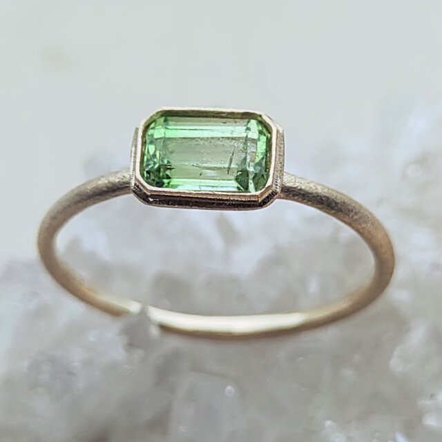 煌めきテリともに秀逸なミントグリーンの美しいグラデーションがとても可愛いタンザニア産バイカラー/グリーングローシュラーガーネット、ブラックライト照射でピンクに輝く蛍光反応をお楽しみ頂けます*新緑のような清涼感のあるカラーは派手すぎず肌馴染みが良いため日常使いできる「大人の上質カジュアル」に。クラシックな美しさを放つ「エメラルドカット」は知的な印象を与え誠実さや上品さを演出します*特有の細かいクラックや液膜インクルージョンが見られますが総じて透明度の高い鮮やかなレアストーンをお楽しみ下さい*リングはアンティーク調マット仕上げ、8~16号(推奨サイズ)の範囲を目安に調整可能、サイズ確定後にマットな覆輪で石留め致します*