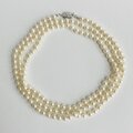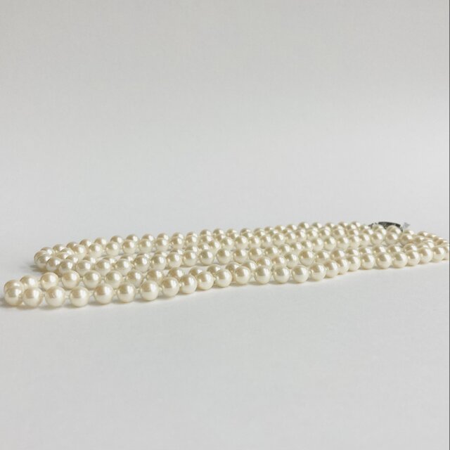 オールノットネックレスの特徴として、万が一糸が切れた場合でもばらばらにならず最小限で抑えられる点や、玉同士が密着していないので擦れあいにくく傷も付きにくい点・また玉同士が少し離れている為、首回りにフィットしやすくなっている点等がございます。この仕様は特に海外で人気があり、比較的高品質アクセサリー類によくみられる仕様です。※弊社の自社工場にて塗装したパールになります。品質の状態も維持されており、剥がれや大きな目立った傷などもございません。稀にピンホールや小さい凹み等が見られる場合がございますが、自社にて検品の上、品質に問題は無く許容範囲とさせて頂いております。