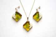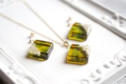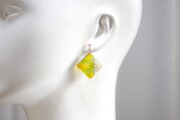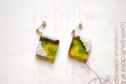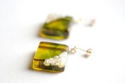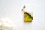 パールとお花をスクエア型のレジンに封じ込め、グリーンとオレンジで着色したピアス。