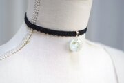 お花とパールを並べ、ホワイトとゴールドでマーブル模様を描き、背景に優しい緑色を乗せたレジンを、ベルベットリボンにタティングレースで装飾を施したチョーカーに仕上げました。